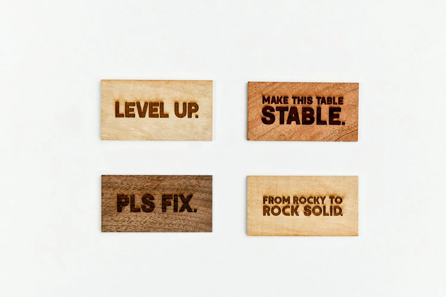 Jason Nopper wanted a memorable business card, so we created a piece that served two functions. To inform, and to offer a facile solution to wobbly tables in the interim. The pieces were made from scrap wood in his shop, and laser-burned with humorous headlines relating to the state of the furniture it was stabilizing. The project won three awards with Applied Arts.